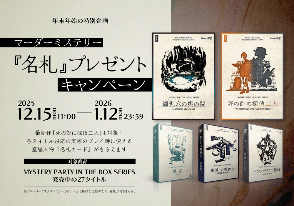 対象商品は最新作『死の館に探偵二人』を含むMYSTERY PARTY IN THE BOXシリーズの各タイトル(※『マーダーミステリー:ザ・トリロジー』を除く)で、ご購入のお客様に実際のプレイ時に使える『名札カード』をプレゼントいたします。